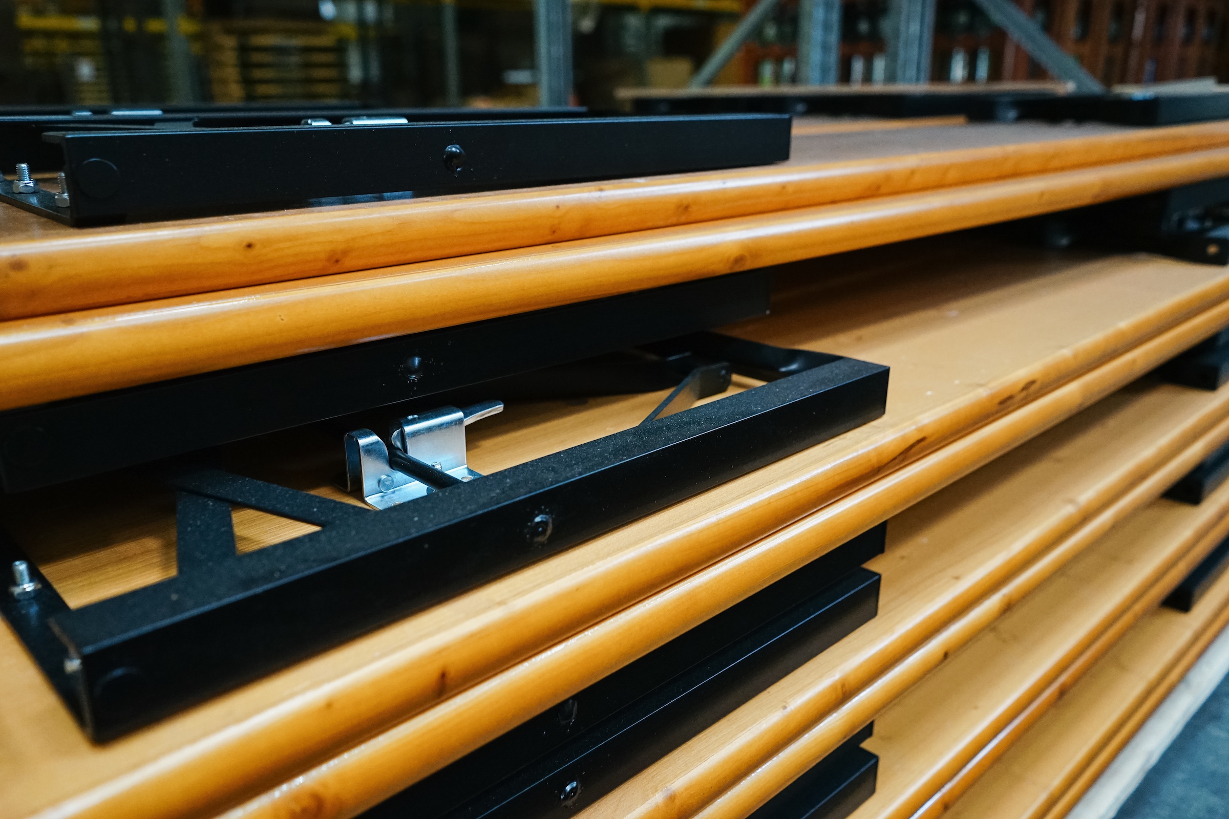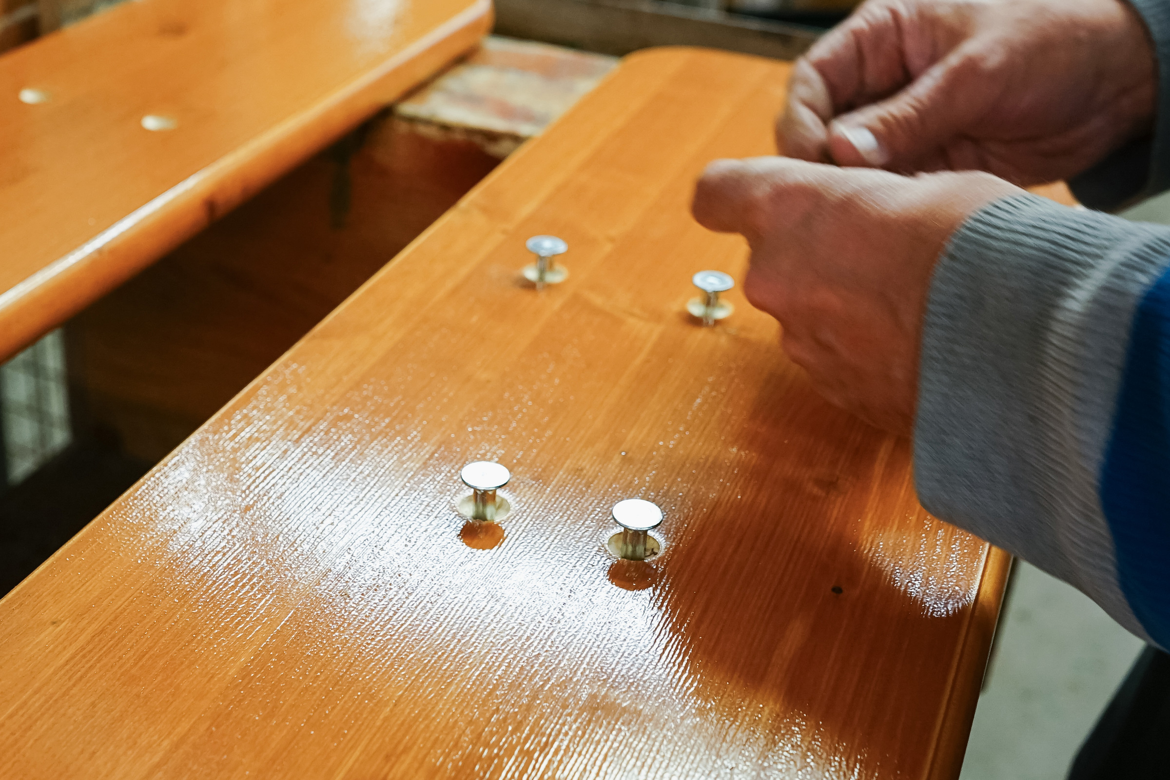 Original GWW-Festzeltgarnituren werden aus ausgewähltem nordischem Fichtenholz gefertigt mit 24 mm starken Tischplatten und besonders robusten 28 mm Bankplatten mit durchgängig geschweißten Gestellen aus stabilem Winkelstahl kombiniert – für maximale Stabilität und jahrelange Nutzung.