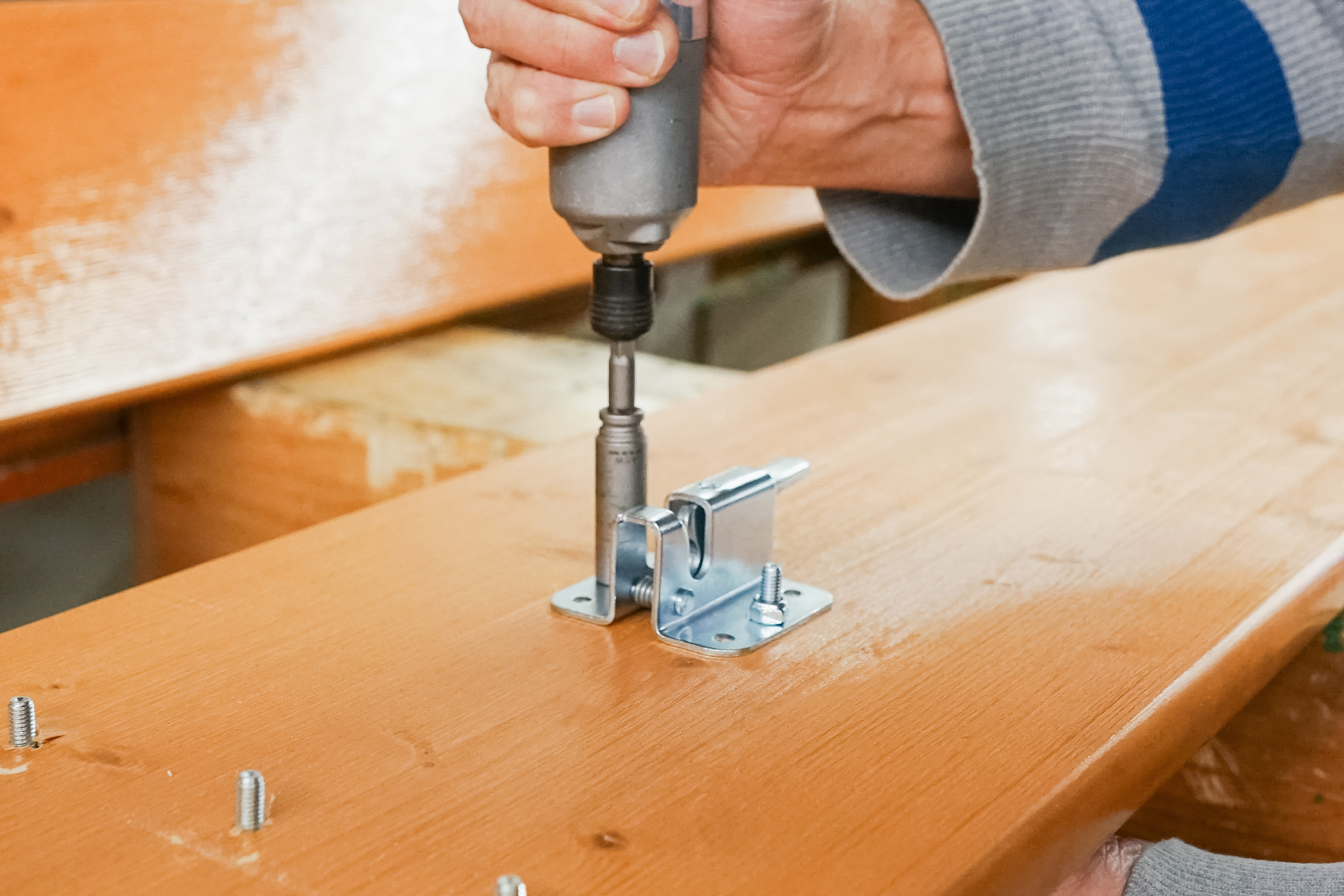 Serienmäßig mit zehn Rippenschrauben und selbstsichernden Muttern je Tisch/Bank